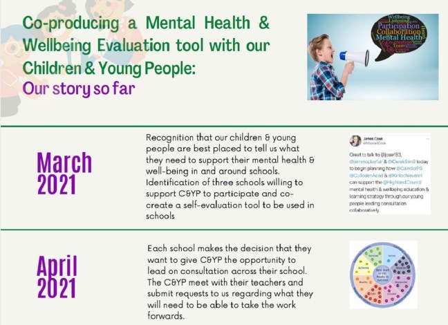As a follow up to our infographic detailing our journey so far in ‘Co-producing a Mental Health and Wellbeing Evaluation Tool with Children & Young People’ we thought you may be interested to find out more. Today we are sharing a short video detailing some of what our C&YP across Highland have told us about what SHANARRI really looks, sounds and feels like to them, and also what they think it should look like in their schools.