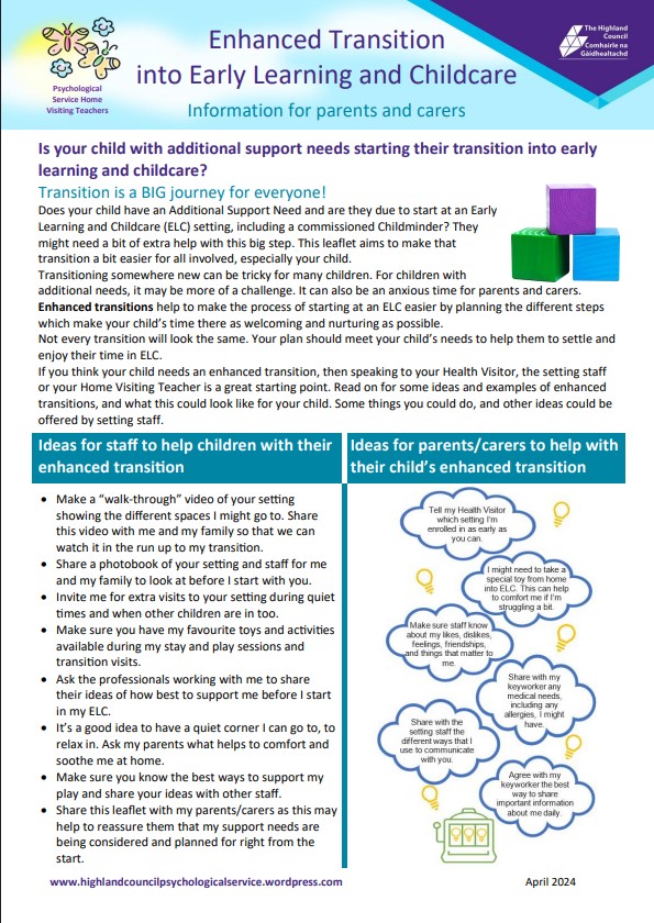 If your child has an Additional Support Need and will be starting nursery soon, they may need a bit of extra help with this big step. This leaflet for parents/carers aims to make that transition a bit easier for all involved, especially your child. Enhanced Transition into ELC. Information for parents