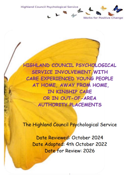 The Highland Council Psychological Service maintains a link with looked after children at home, away from home, in kinship care or in out-of-area authority placements. Educational Psychologists work alongside the Lead Professional Social Worker through the Highland Practice Model. Education and care needs of care experienced young people are best met in a holistic way, whilst also keeping in touch with local community partners. Please see the service policy here: