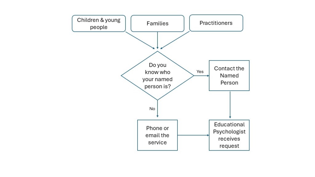 Requests for direct support in relation to a child or young person ideally should be made in line with the assessment in a Child’s Plan. An initial consultation or discussion with the Educational Psychologist is generally beneficial to discuss what would be most helpful. Requests for direct involvement with a child/young person MUST have the full agreement of the parents/carers who have parental responsibilities and where the child is old enough to give a view and to understand the request, the child/young person must also agree with the request.