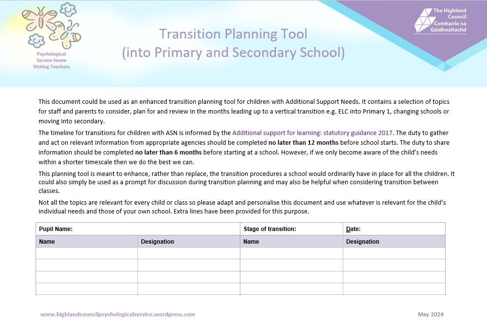 This Transition Planning Tool could be used to support enhanced transitions for children with Additional Support Needs. It contains a selection of topics for staff and parents to consider, plan for, and review in the months leading up to a vertical transition e.g. ELC into Primary 1, changing classes or schools, or moving into secondary education.
